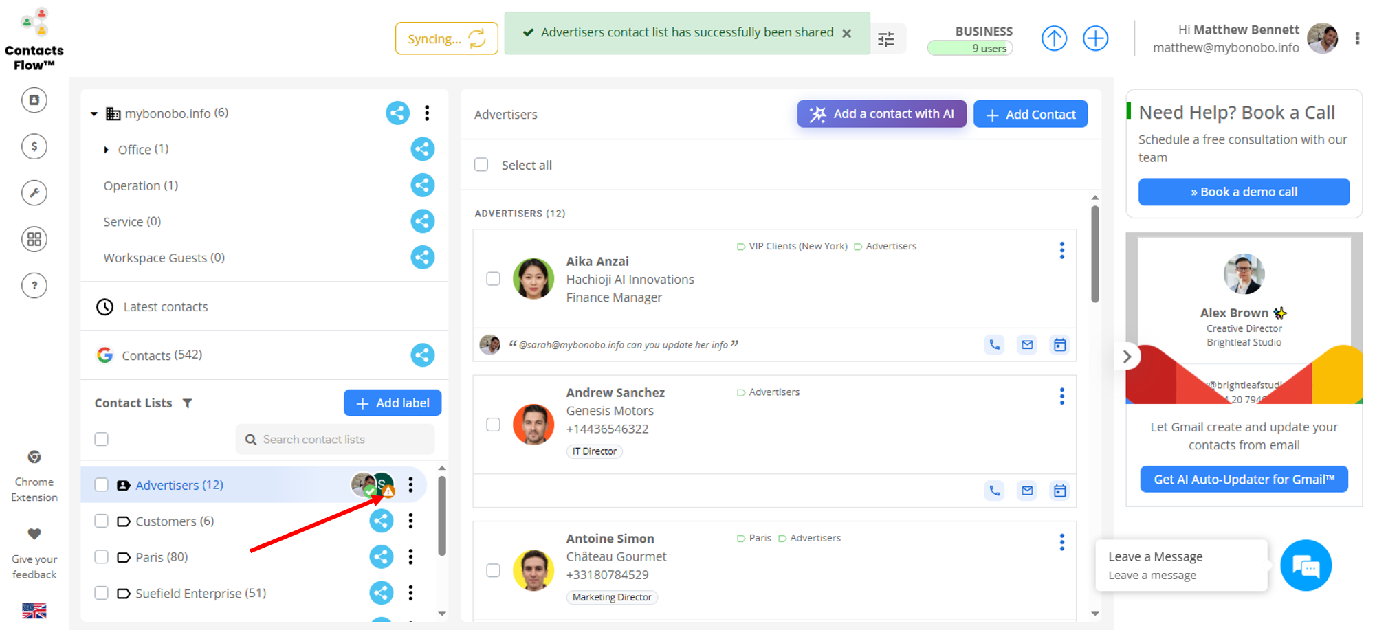 Voila! The shared label is now visible on the ContactsFlow™ (formerly Shared Contacts for Gmail™) dashboard and in Google Contacts, synchronized in real-time.