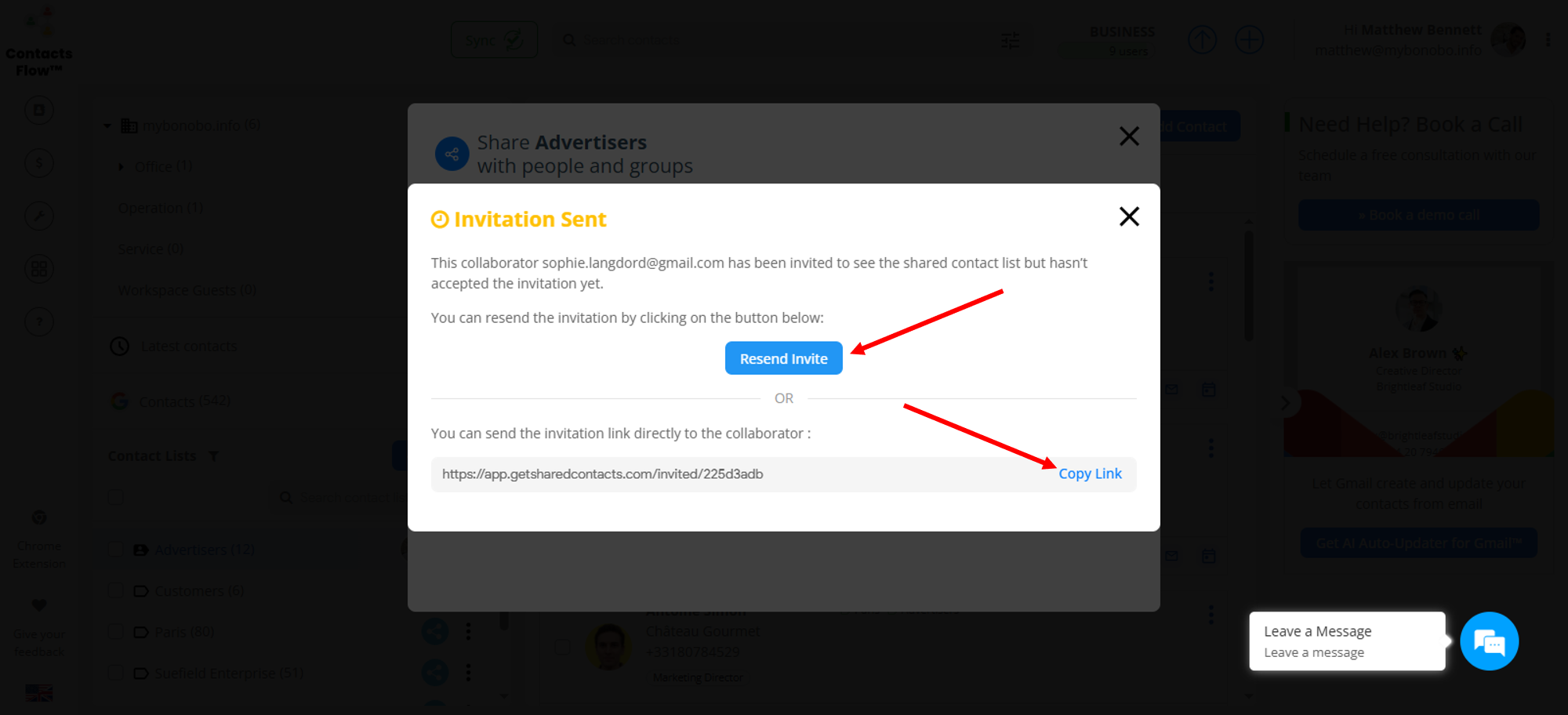 Click “Resend invite” to automatically send a new email to the collaborator. Click “Copy link” to copy the access link and share it through a messaging app for quicker access. Both options direct the collaborator to grant permission to the app and access the shared contacts.