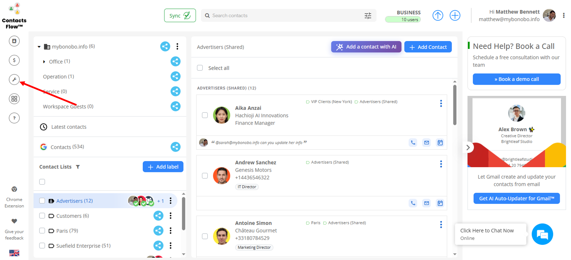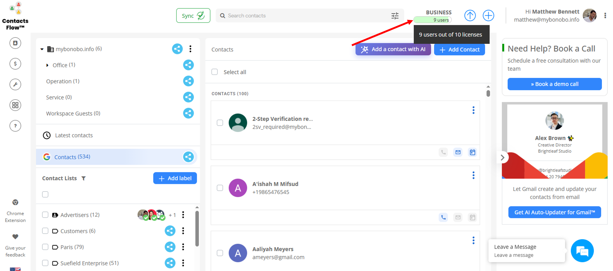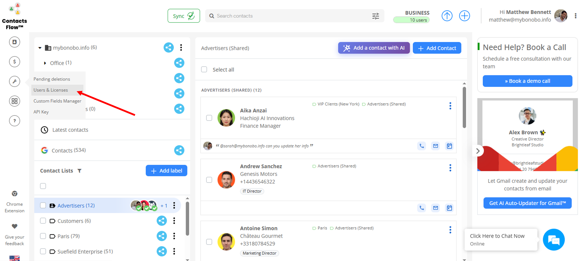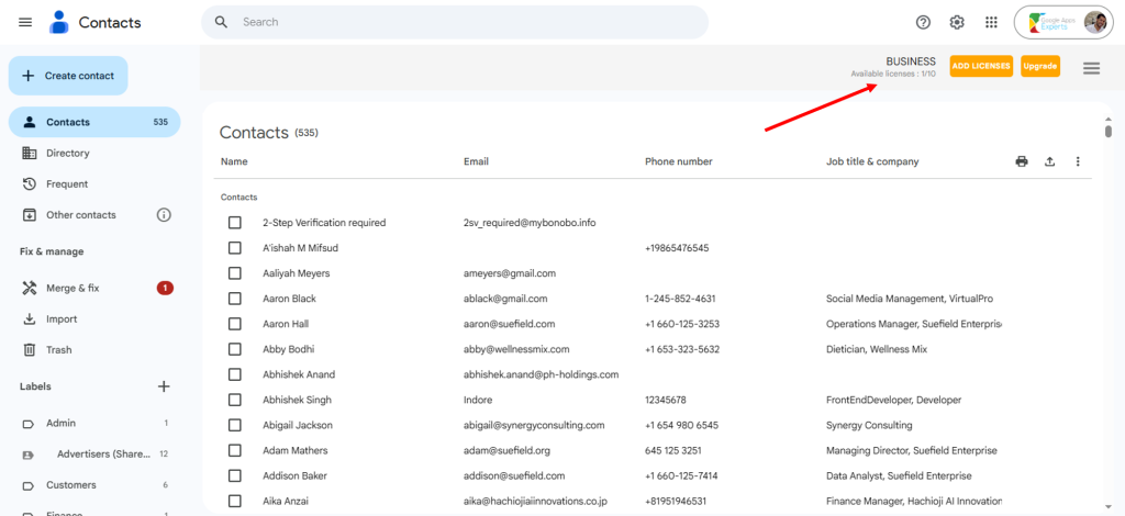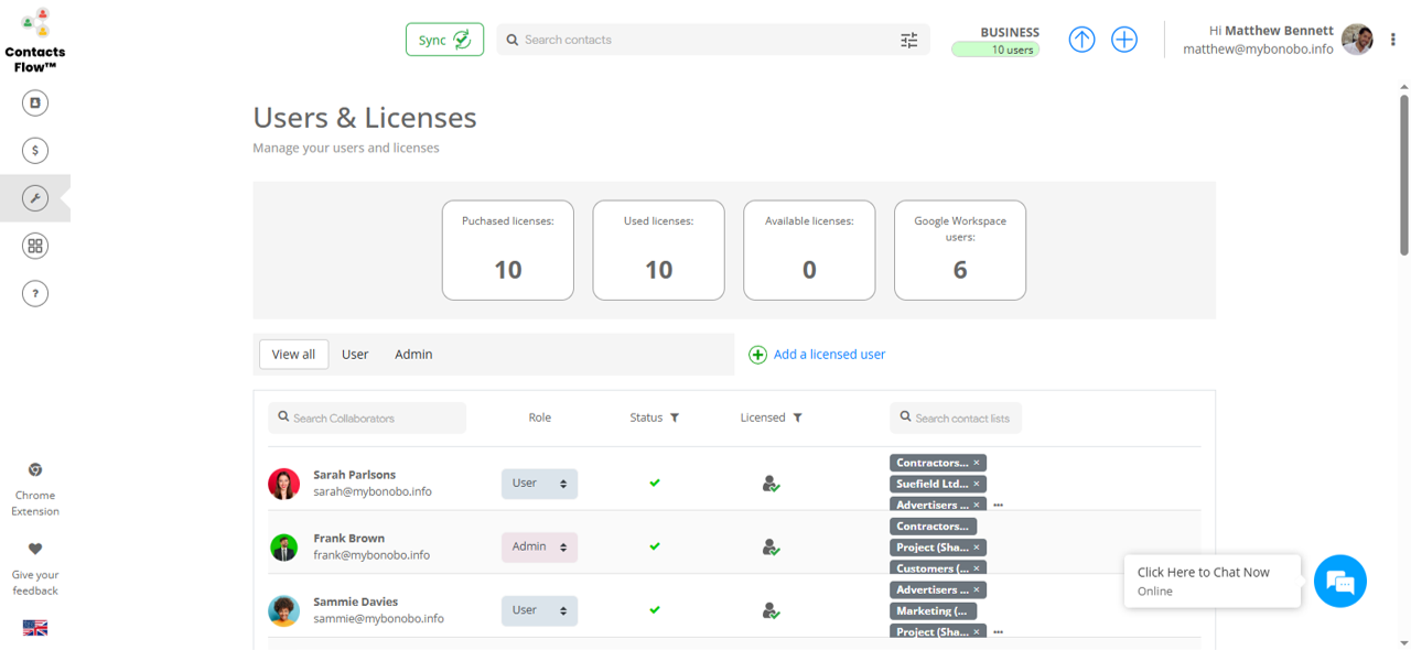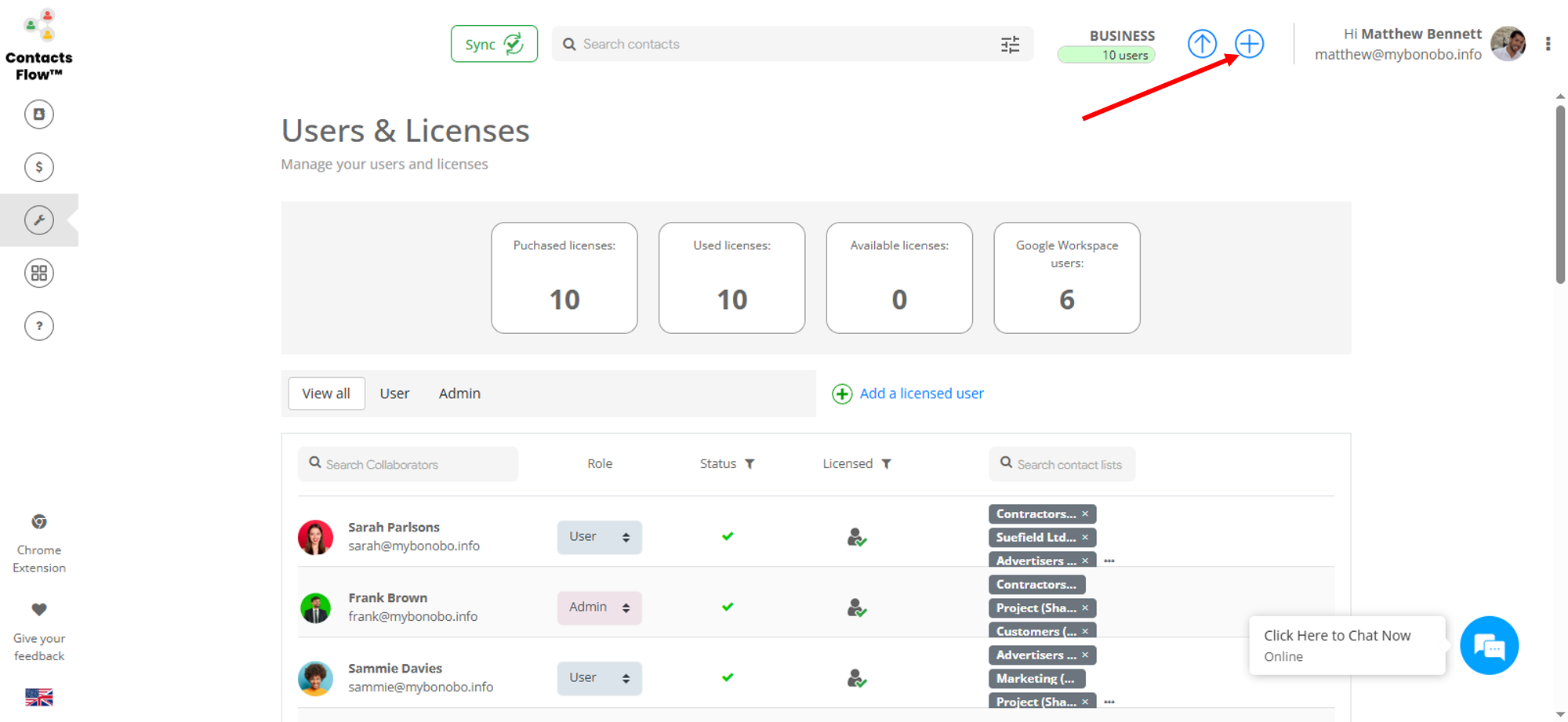 Once you have successfully installed your Chrome extension, your Google Contacts dashboard will have the Chrome add-on as seen below. The available licenses will be displayed at the top right side of the screen. To purchase additional licenses, click the ‘Add Licenses‘ and follow the prompts. Please note that only admins have this button.