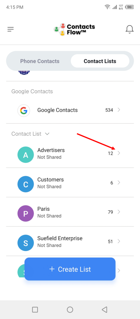 The app default opens by showing Phone Contacts first. To view your labels, tap the Contact Lists tab.