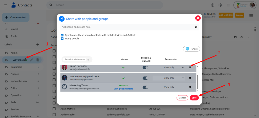 If you don’t have it yet, download it from the Chrome Web Store. Once installed, (1) open Google Contacts and click the Share icon next to the label. This will open the collaborator window. Then, (2) click the bin icon on the right side of the collaborator’s row to remove their access, then (3) click Save to apply the changes.
